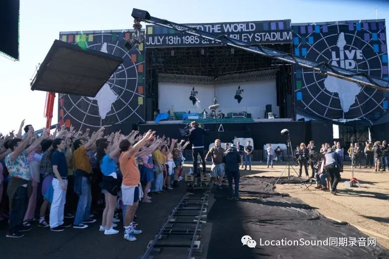 NH:这是30到40人的规模,两个不同的录音,我们换了人,所以我们得到的声音比我们每个人的人数更多。我们决定在外面录制声音,让它感觉更像温布利体育场户外的感觉。我们星期六在Shepperton Studio预订了一个外部空间,那里很安静(没有人在拍摄制作)。我们排成了八个麦克风,前面有一个LCR,后面有几个麦克风,还有一个是较远处安置的麦克风,然后是一个悬臂,我们可以用它做一些动作。我们有8个耳机和一些显示器在外面排成一排,我们会以八人一组的方式带人。他们戴上耳机听音乐,我们会通过Live Aid的视频与他们一起回应,无论是唱歌还是大喊大叫。我们一直记录下来。