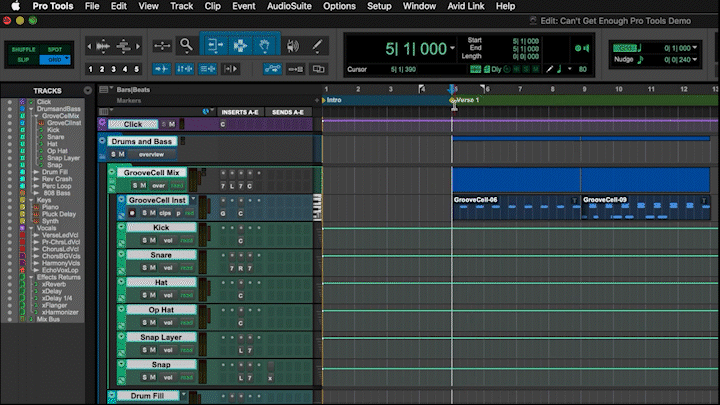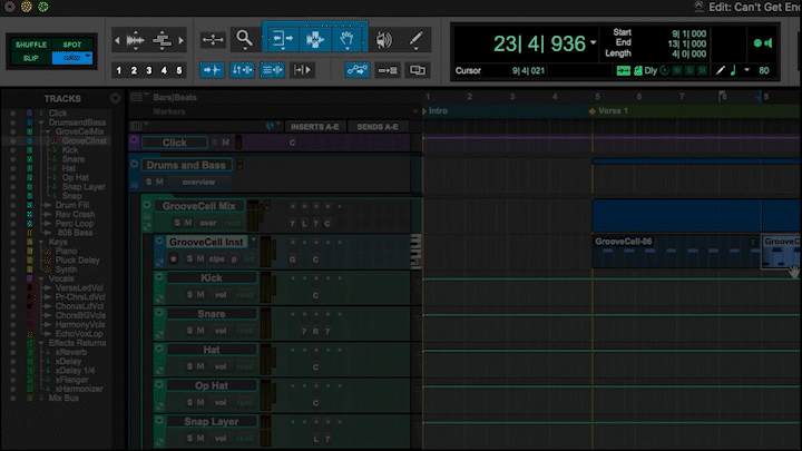 此工程中的所有音轨都分组在文件夹中,文件夹可以帮助组织工程中的内容,就像您在左侧查看曲目列表时所看到的那样,关闭文件夹将隐藏音轨以便整理视图。