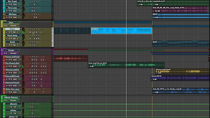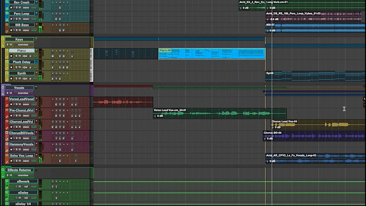 正如你所看到的,这些音轨从上到下排列着歌曲的所有元素,从鼓开始,然乎是贝斯、基础音和循环,最后是人声,在人声下面是一些效果,随后是一个混音母线(mix bus)轨道。
