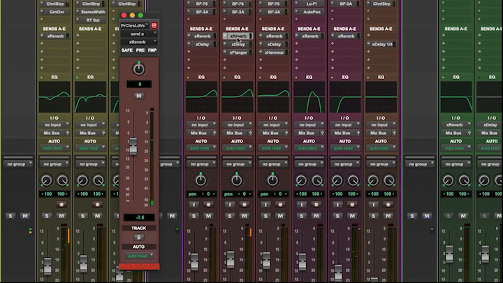 来看看第一主声音轨,单击“send”可调出一个“电子推子”,以便调整音轨上的混响音量。