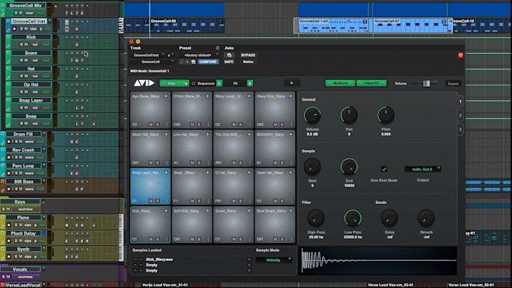 这条音轨的主要节拍采用槽形单元鼓乐器,鼓的中间部分是在乐器音轨上,但我们已经将各个鼓的声音分配到了不同的轨道上,因此,你可以平衡它们,并使用通道条插件来应用处理,或插入另一个均衡器和动态插头(EQ)。