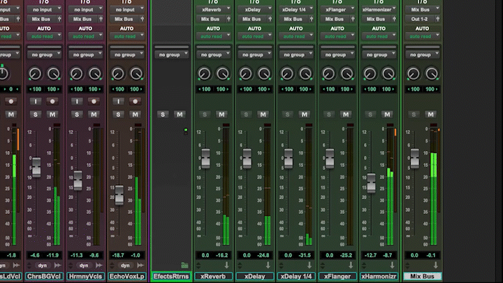 最后一组轨道是效果返回(effects returns),这是混响延迟等等问题产生的地方,这些效果是产生在每个轨道上的。