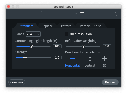 短暂的声音可以通过使用频谱修复套索工具来修复,以雕刻出凹凸,用其他音频替换它,或将其从其余频率中移除。