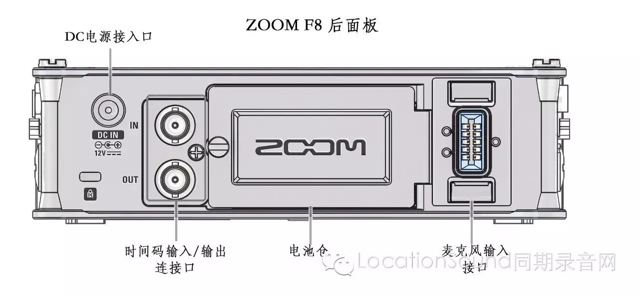 F8的后面板主要是DC电源接口和电池仓,另外还有时间码输入输出BNC口,一个ZOOM专用话筒的接口