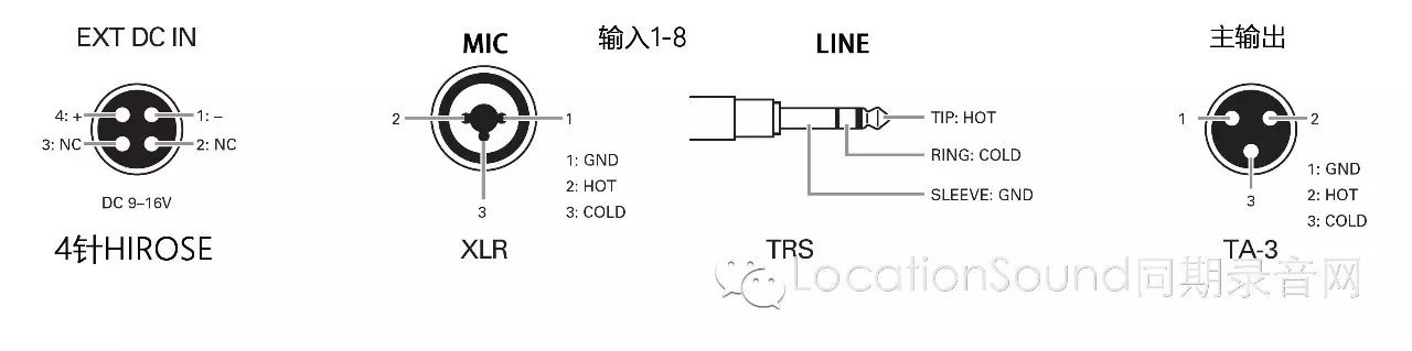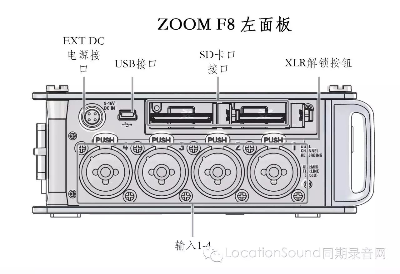 左面板有外接电瓶的接口,USB的接口,已经SD卡槽和1-4路的输入口,特别需要说明的,也许因为F8的紧凑,F8的输入电平,MIC麦克档和LINE线路档并没有开关的,而是靠XLR卡侬和大三芯TRS不同输入端实现的。一开始可能会不习惯,但其实这样用下来有很大的好处,线路麦克输入再不会忘了设置,几乎不会搞错。
