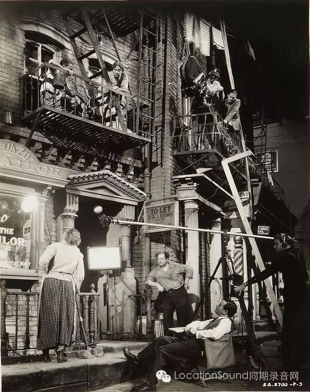 自从1927年《爵士歌手》开创有声电影时代以来,电影人想尽各种方法来进行电影的声音制作,没有指向话筒,没有手持挑杆,请注意图上的方式,一种类似摇臂的可旋转推动带轮的架子,架上广播话筒,很长时间都是这么进行同期声的录制,一直沿用到上世纪70年代。