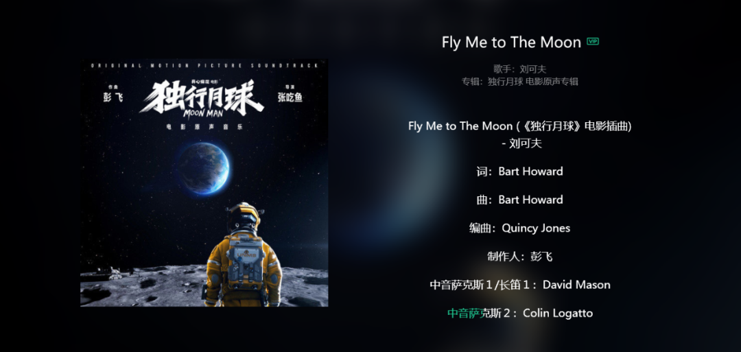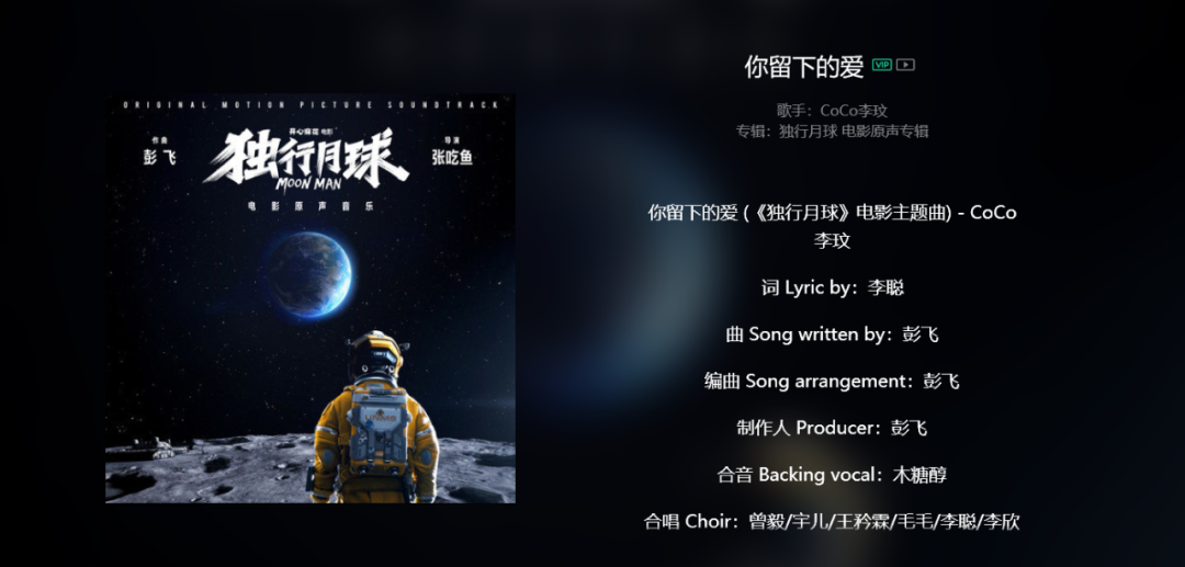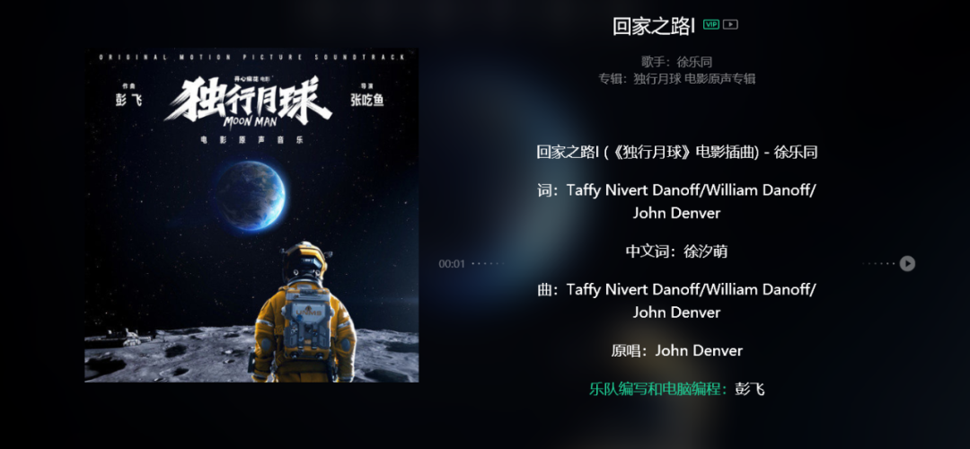 因版权及Vip原因,大部分歌曲无法放出。小伙伴们可点击后方链接查看:《独行月球》 电影原声专辑 – QQ音乐。