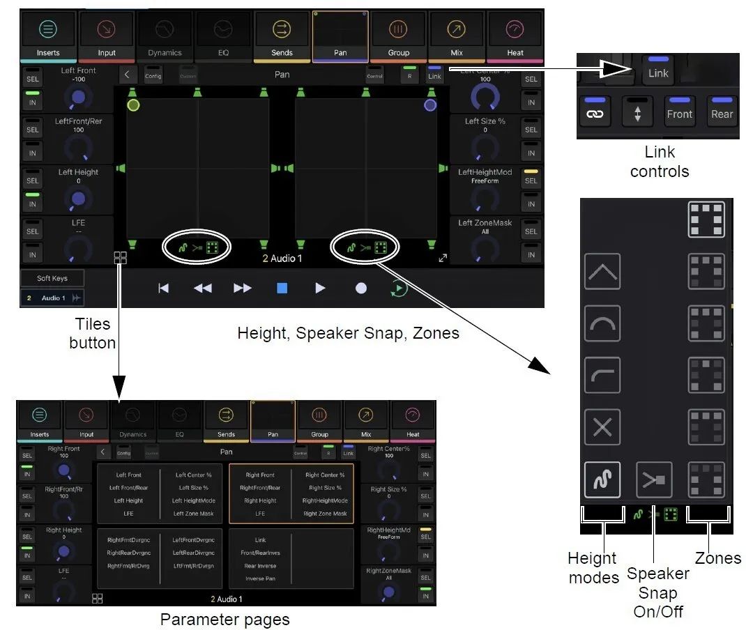Avid Control app 中的通道视图平移图现在支持杜比全景声,并具有二维网格,并可访问所有声相参数、高度模式、扬声器设置和区域控件。平底锅球尺寸现在反映了高度函数值,随着高度的增加而增长,随着高度的降低而缩小。