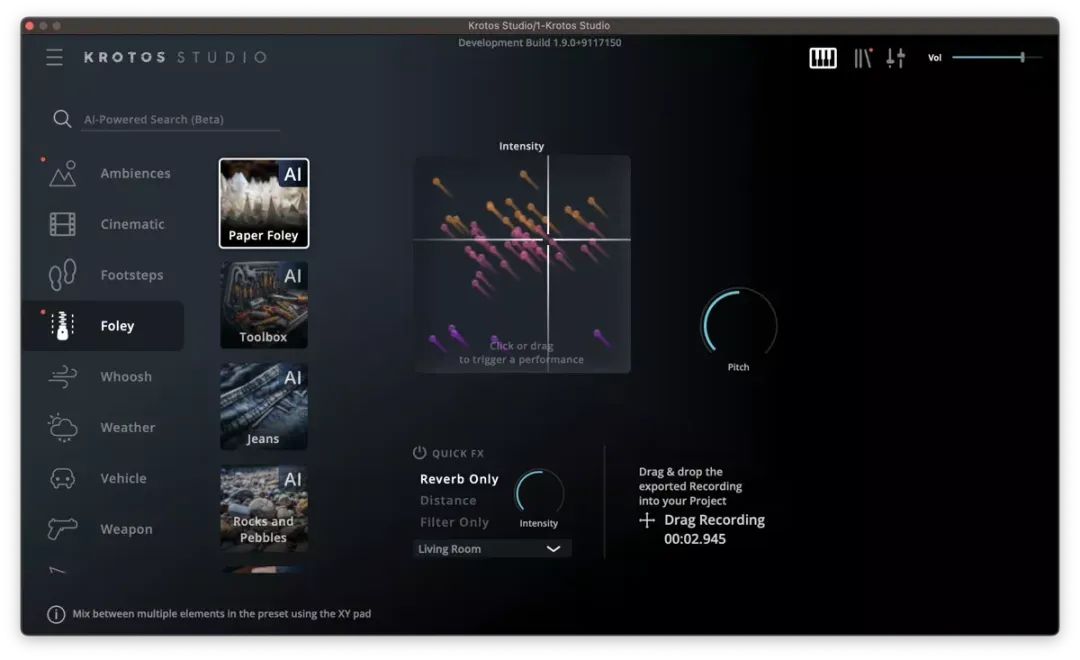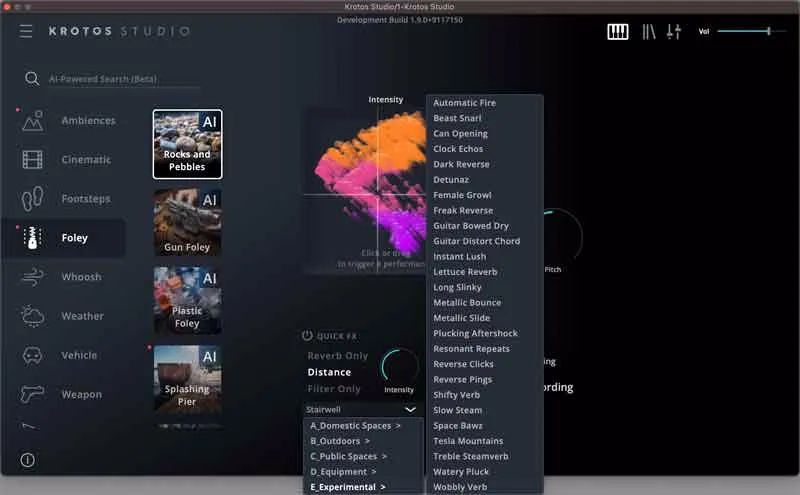 除了快速效果,Krotos Studio大大加强了其AI驱动的能力,现在包括AI驱动声音效果的预置和一个全新的AI搜索引擎功能。AI效果预设,展示一个X-Y形式的Pad接口,有一个集群的彩色针,代表每一个声音片段的音色和强度,这允许用户通过直观互动来创造良好的效果,同时塑造的声音以适应项目。新AI驱动的搜索引擎-其中采用了AI智能学习,显着提高了搜索的效率,搜索时可输入更广泛的范围,而不需要填写预设的名字,使得搜索过程更有效率和用户友好。一体化的先进人工智能AI技术不仅简化声音设计过程,也促进更多的创造性和探索性工作流程的最终受惠用户。