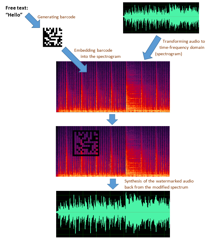 要嵌入数字水印,首先将音频波转换为频谱图,添加数字水印,然后再将其转换回音频波格式。这个过程保证了水印对人类是不可听的,并且对修改具有抵抗力。