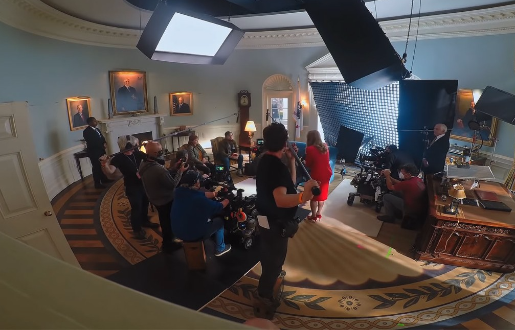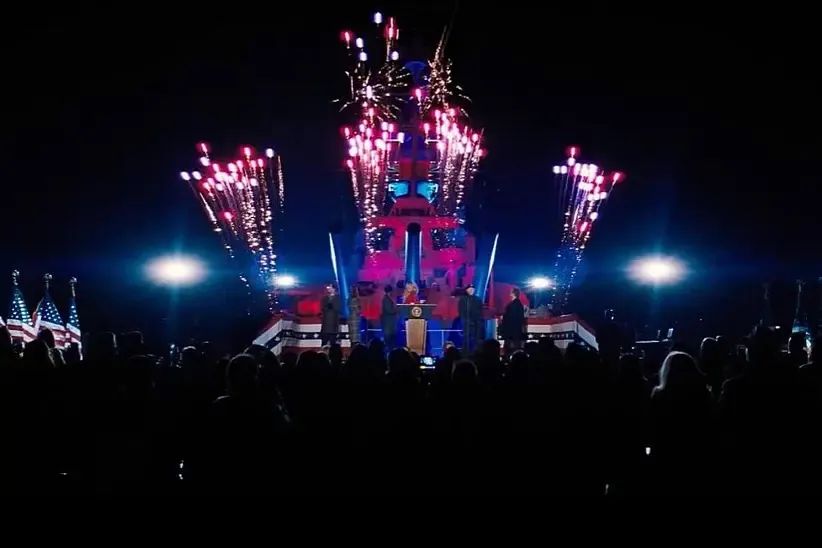 另一个有趣的场景是奥尔良总统宣布彗星将撞击地球。她在一艘海军舰艇上发表演讲。她的演讲出现在不同地方的不同屏幕上,包括在船上看到。你能谈谈对她的声音不同处理方法么,以及构建场景切入不同位置的方法吗?