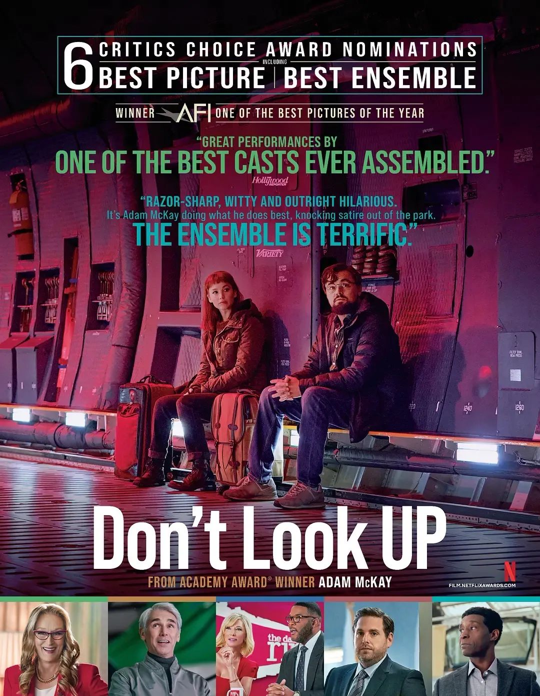 由Netflix(网飞)制作的院线电影《不要抬头》是一部精彩的黑色讽刺喜剧,讲述两位水平不高的天文学家发现即将有颗陨石毁灭地球,他们必须警告不相信这一情况的普罗大众。这部影片由奥斯卡金像奖得主亚当·麦凯Adam McKay(《大空头》)担任编剧和导演,主演阵容包括莱昂纳多·迪卡普里Leonardo DiCaprio,提莫西·查拉梅,Timothée Chalamet,詹妮弗·劳伦斯Jennifer Lawrence,凯特·布兰切特Cate Blanchett。