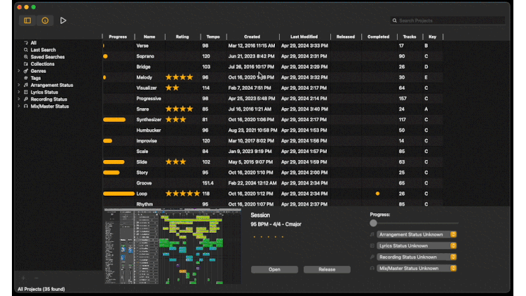 Logic Buddy还可以帮助跟踪歌曲进度,包括编曲、歌词、录音以及混音/母带状态,并使用星级评分和标签保持条理清晰,以便日后更容易找到项目。此外,它还具备损坏项目恢复功能,可以修复无法在Logic Pro中打开的项目文件等。
