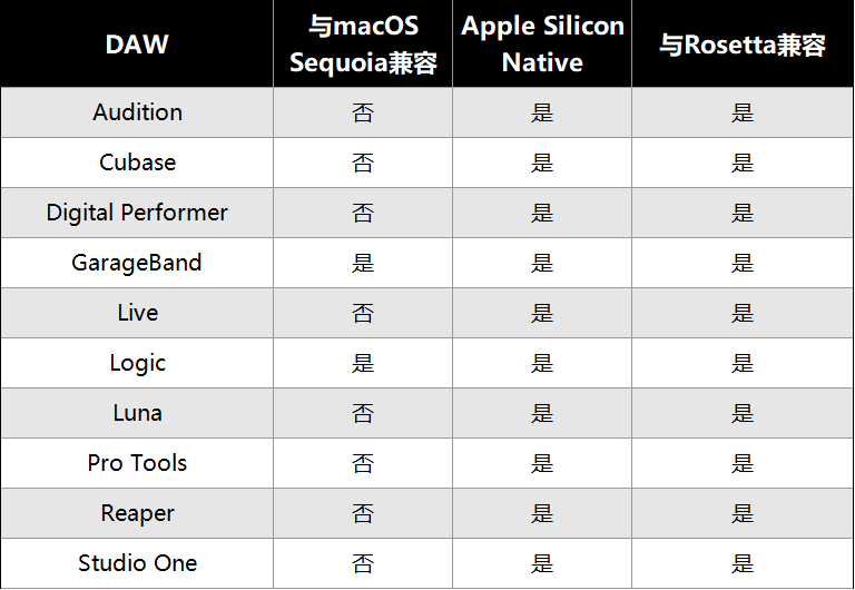 这是主要数字音频工作站(DAW)对Apple Silicon计算机和macOS Sequoia的支持情况。