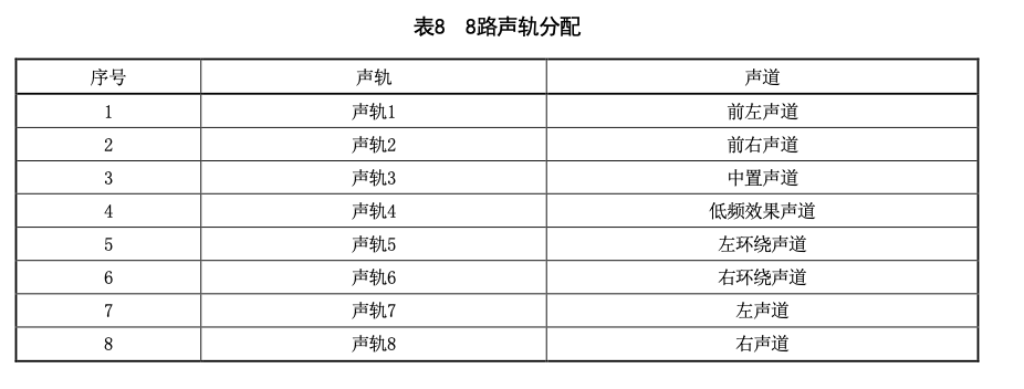 全文一共11节加1个“主观评价方法”的说明附录,我们直接略过其它部分,跳到第8节声音要求,具体规定了采样频率及量化位深,轨道数量及声道分布等: