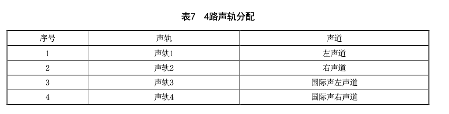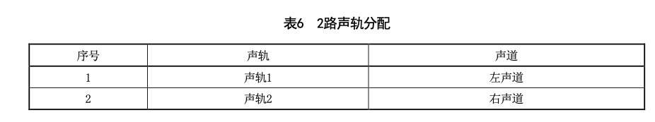 高清电视剧母版和4K超高清电视剧母版声轨数量为2路、4路、8路时,应符合表6~表8的要求,用于存储电视剧节目的立体声或5.1环绕声。其中,立体声采用左、右声道,5.1环绕声采用前左声道、前右声道、中置声道、左环绕声道、右环绕声道、低频效果声道。
