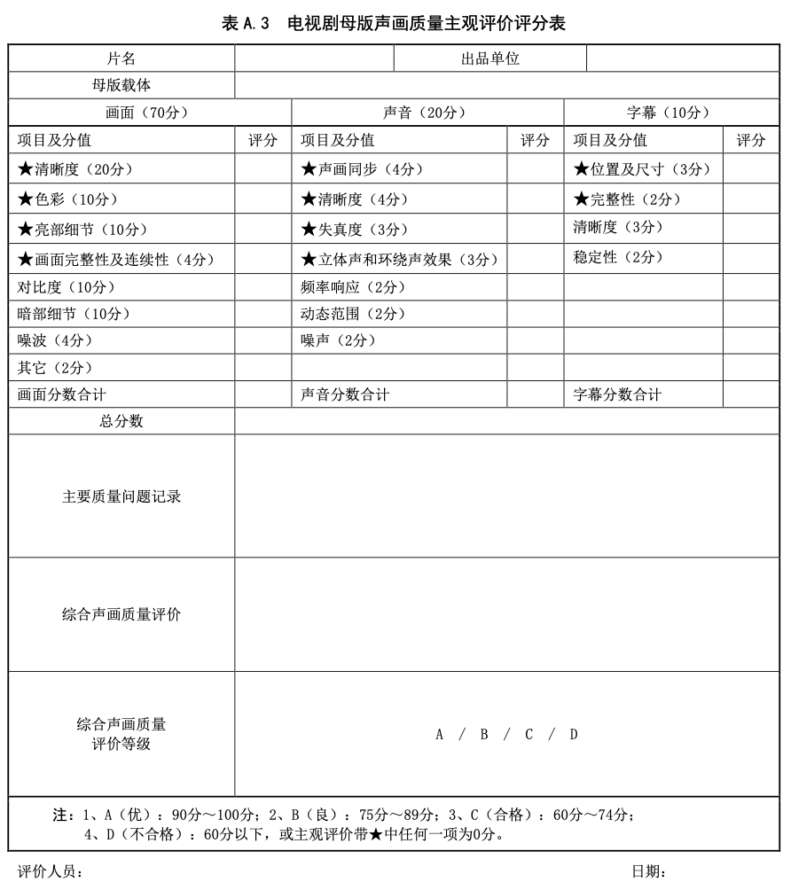 感觉声音还是不被重视,虽然《规范》对音视频都有详细的技术要求,对于目前较混乱无标准的状态无疑是非常及时的。但遗憾的是,在主观评价体系还是沿用GD/J 033—2010标准,画面70分,声音20分,字幕10分,声音所占比例只有1/5,在沉浸声时代是不是有些太低!
